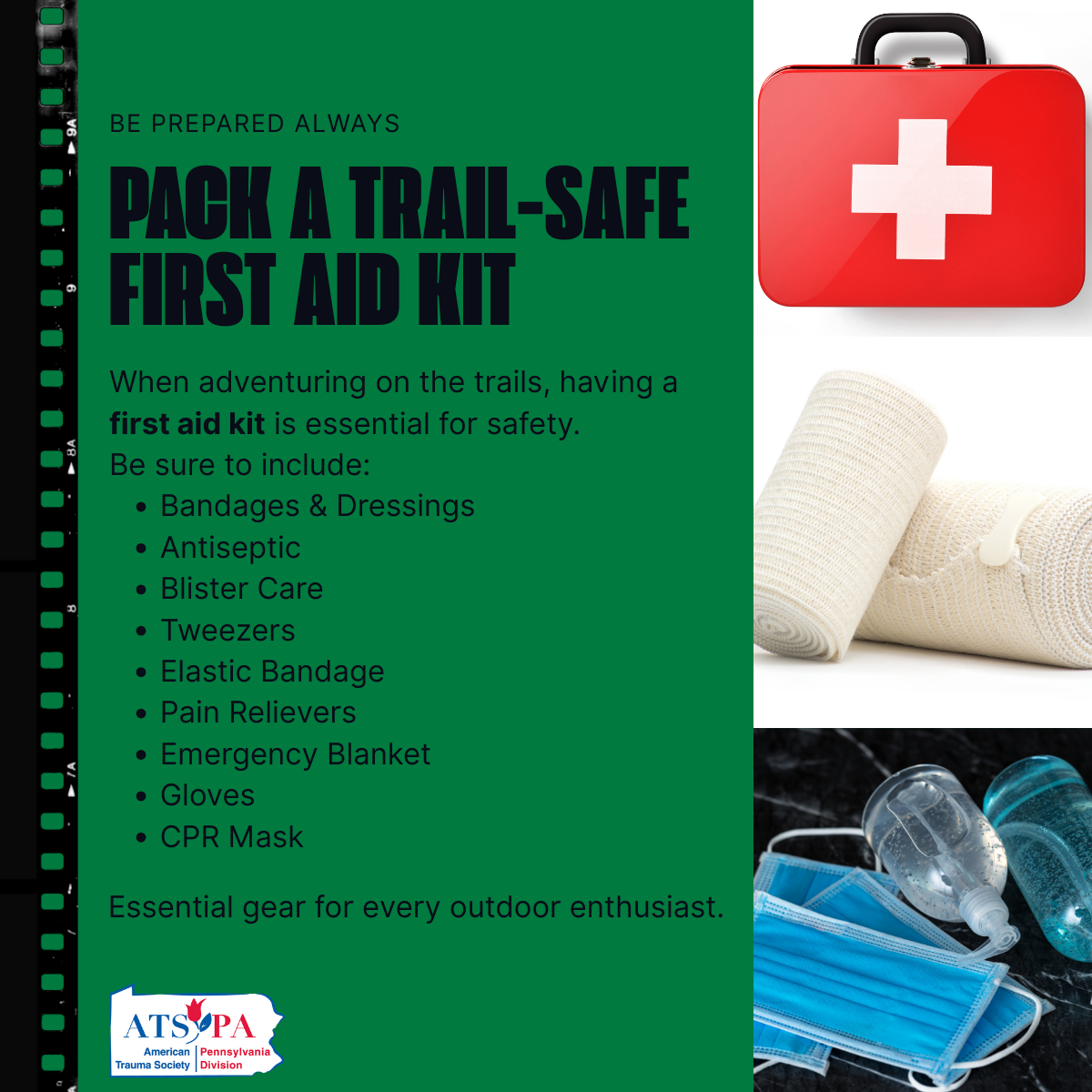 A good first aid kit is lightweight, organized, and tailored to your needs. For Pennsylvania’s outdoor conditions, consider packing: