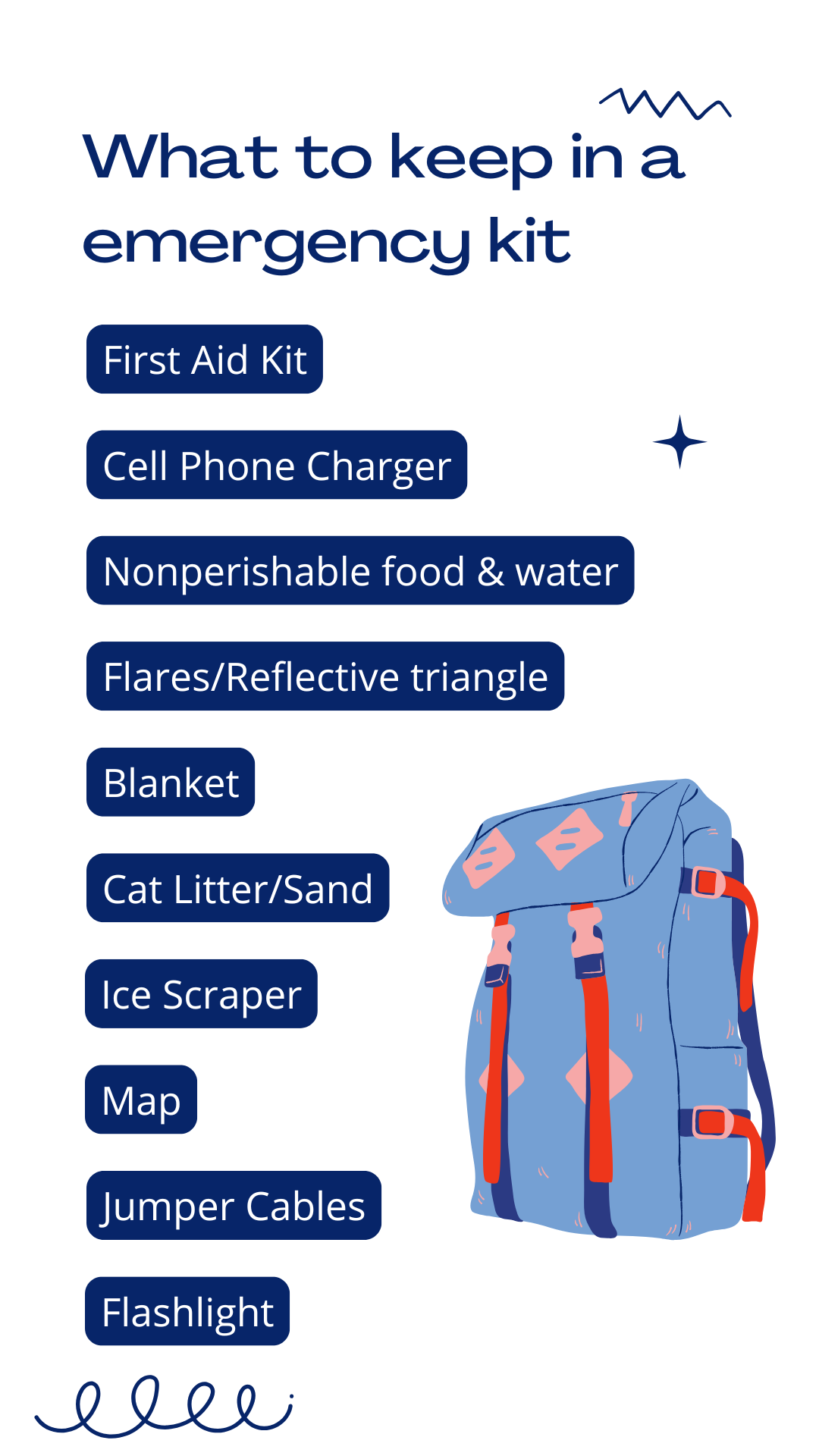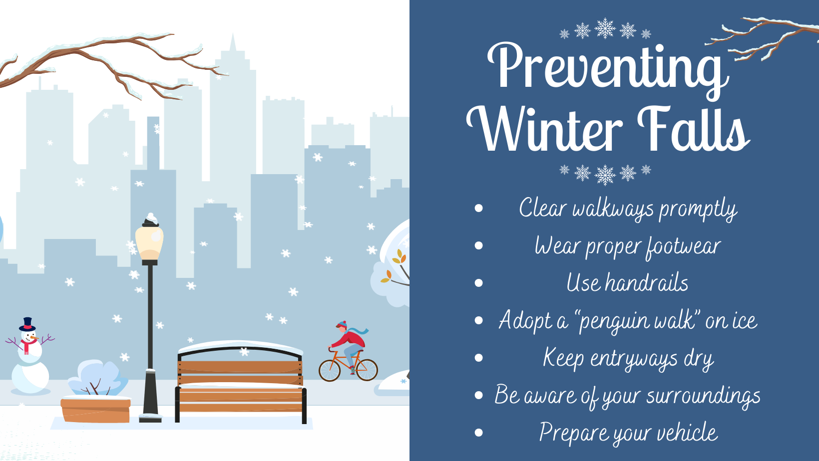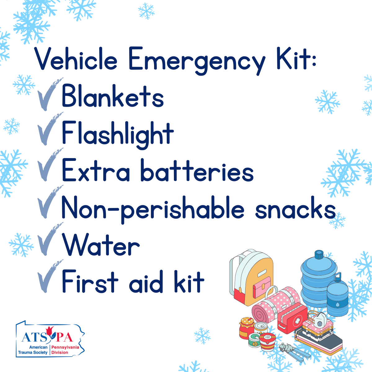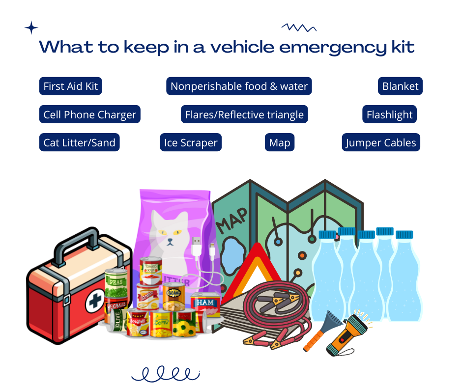 - Keep a winter emergency kit in your vehicle (blankets, flashlight, shovel, traction aids, water, and snacks).
