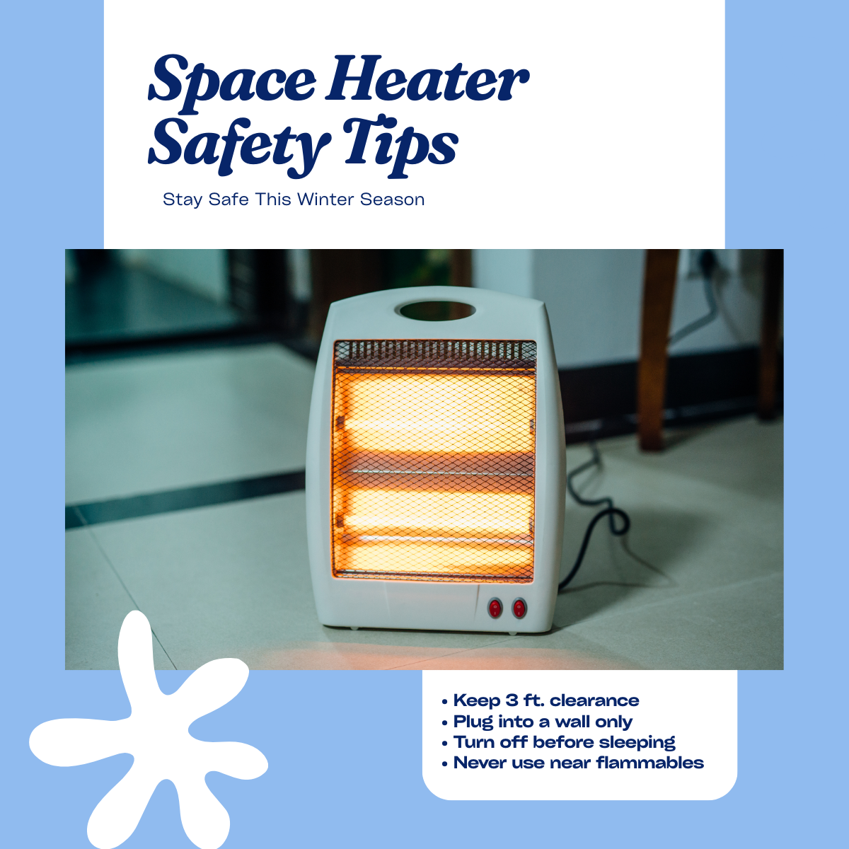 - Use space heaters safely—keep them at least three feet from anything flammable and never leave them unattended.